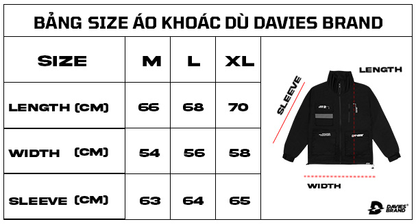 - Hoàn thiện form áo với bo chun tay áo và phần điều chỉnh thân áo bằng dây rút. Kích thước áo là kết quả trung bình cộng từ hơn 10.000 người sử dụng áo khoác Davies. Kết quả tinh chỉnh mang đến kích thước phù hợp với hầu hết người mang, form áo từ vừa vặn đến rộng thoải mái nên dễ dàng chọn lựa theo sở thích nha.