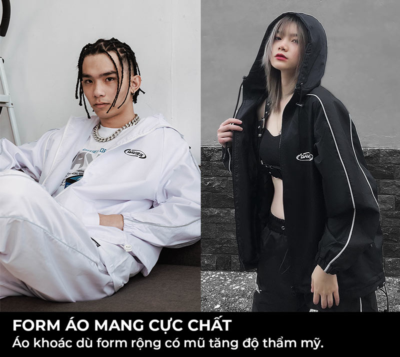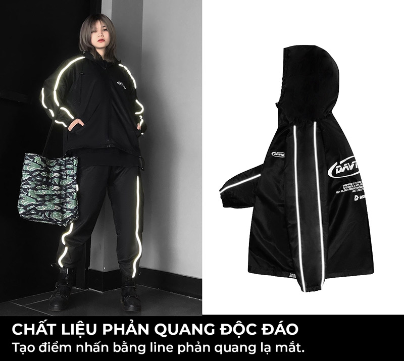 Không giống các thiết kế áo khoác basic, local brand Davies làm mới thiết kế áo khoác dù basic bằng cách tạo điểm nhấn bằng line phản quang lạ mắt.