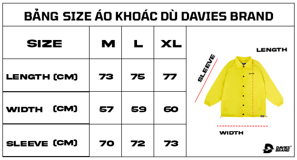 Bảng size thuộc kích thước tiêu chuẩn riêng Davies phù hợp với hầu hết các bạn nam/nữ. Dễ dàng lựa chọn size từ vừa vặn cho đến áo khoác form rộng thoải mái bao gồm ba size M/L/XL.