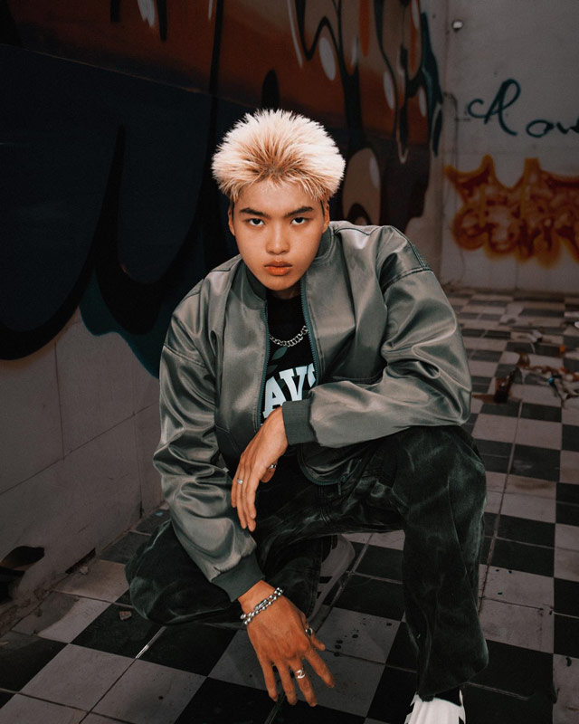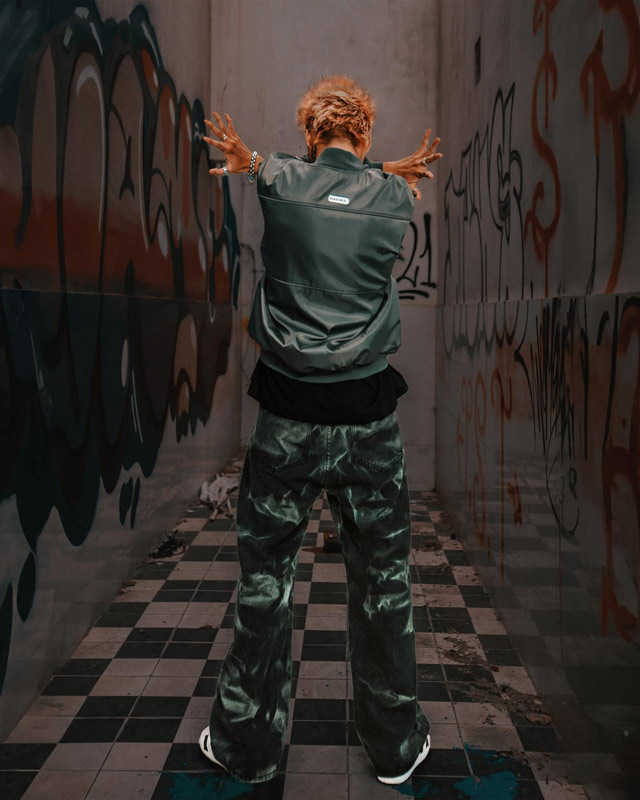 Thay thế các hình graphic phổ biến bằng phụ liệu nhãn Davies bạ inox. Sự độc đáo còn được thể hiện bằng các đường may hai kim phần lưng áo