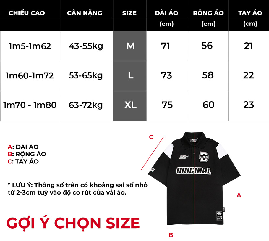 Đừng quên tham khảo chi tiết bảng size bên dưới nha cũng như gợi ý chọn size phù hợp với bạn nhé.