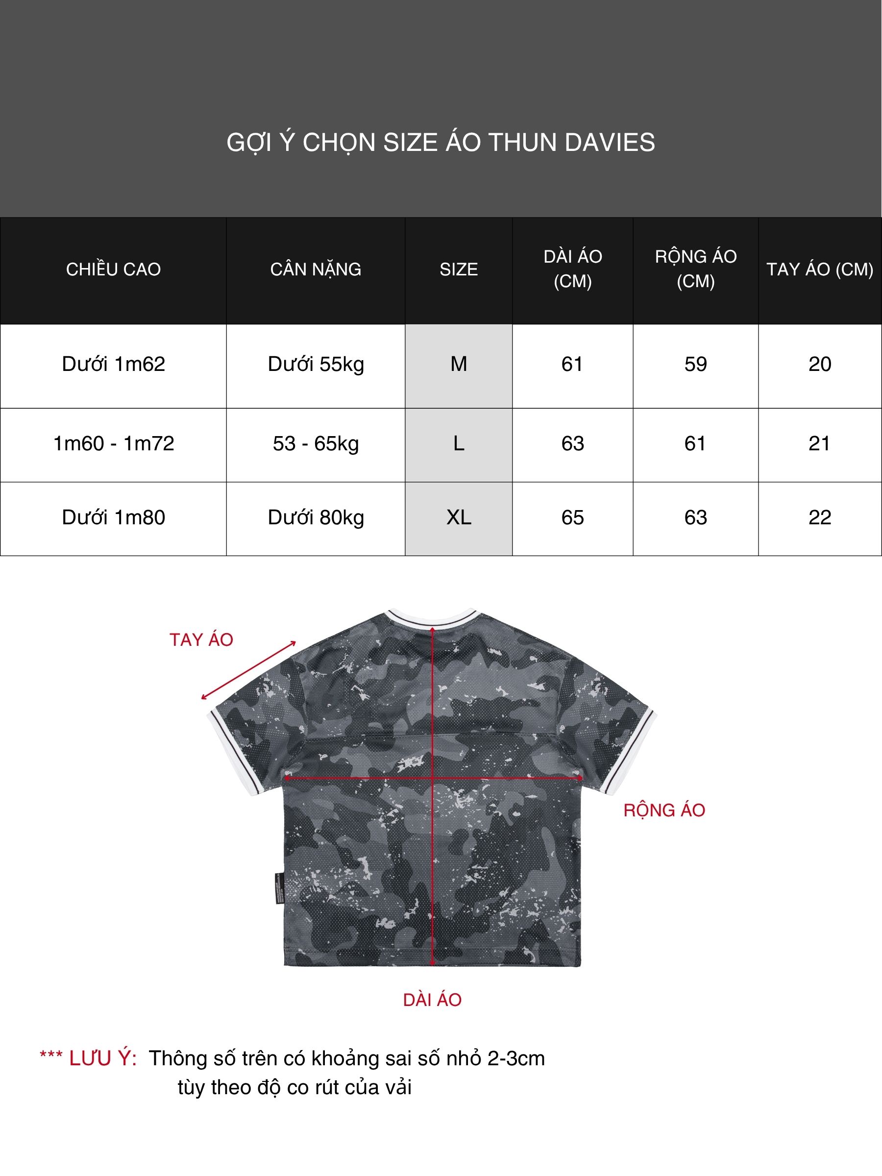 Đậm chất hiphop, “Crew Jersey Tee” từ DAVIES mang đến vibe thể thao đường phố mạnh mẽ và phóng khoáng. Với họa tiết Camo kinh điển được tái hiện bằng công nghệ in chuyển nhiệt sắc nét, chiếc áo là tuyên ngôn về tinh thần “dám khác biệt” — đậm chất thương hiệu DAVIES.